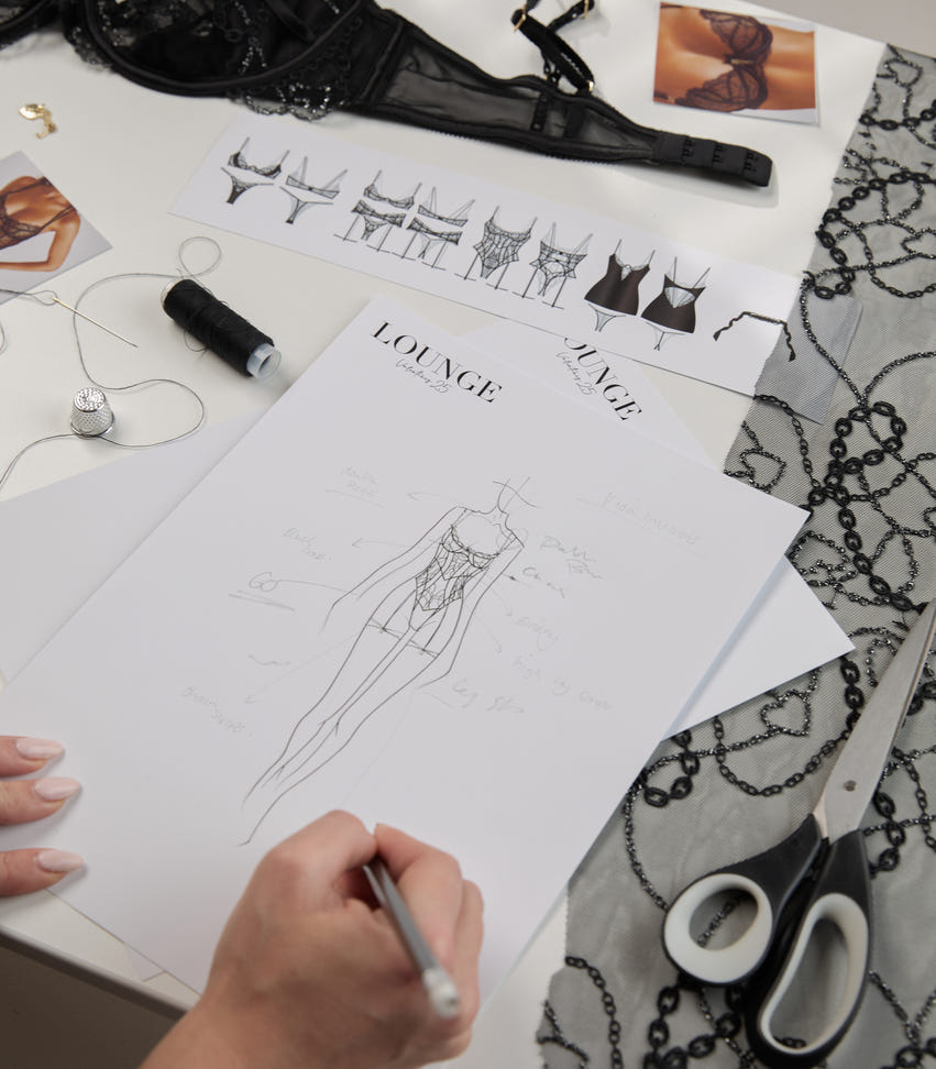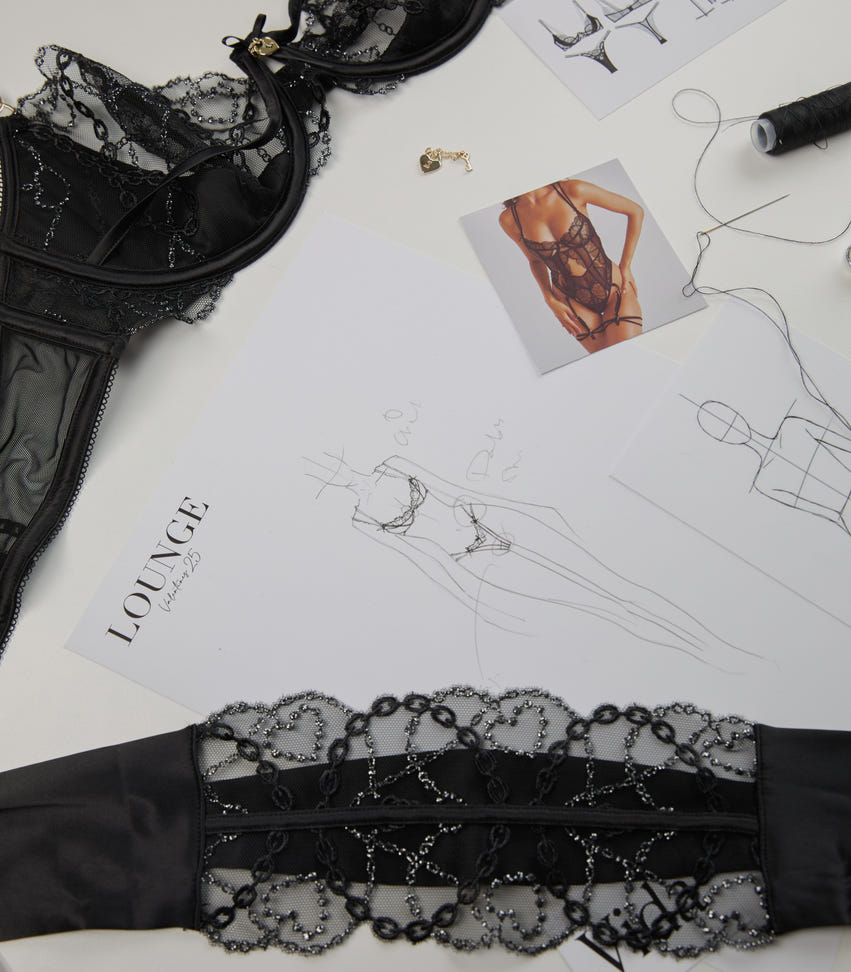 Diese Zusammenstellung tiefschwarzer Dessous wird durch eine kettenartige Stickerei verbunden, die die Dekadenz und das Drama der Liebe perfekt einfängt.