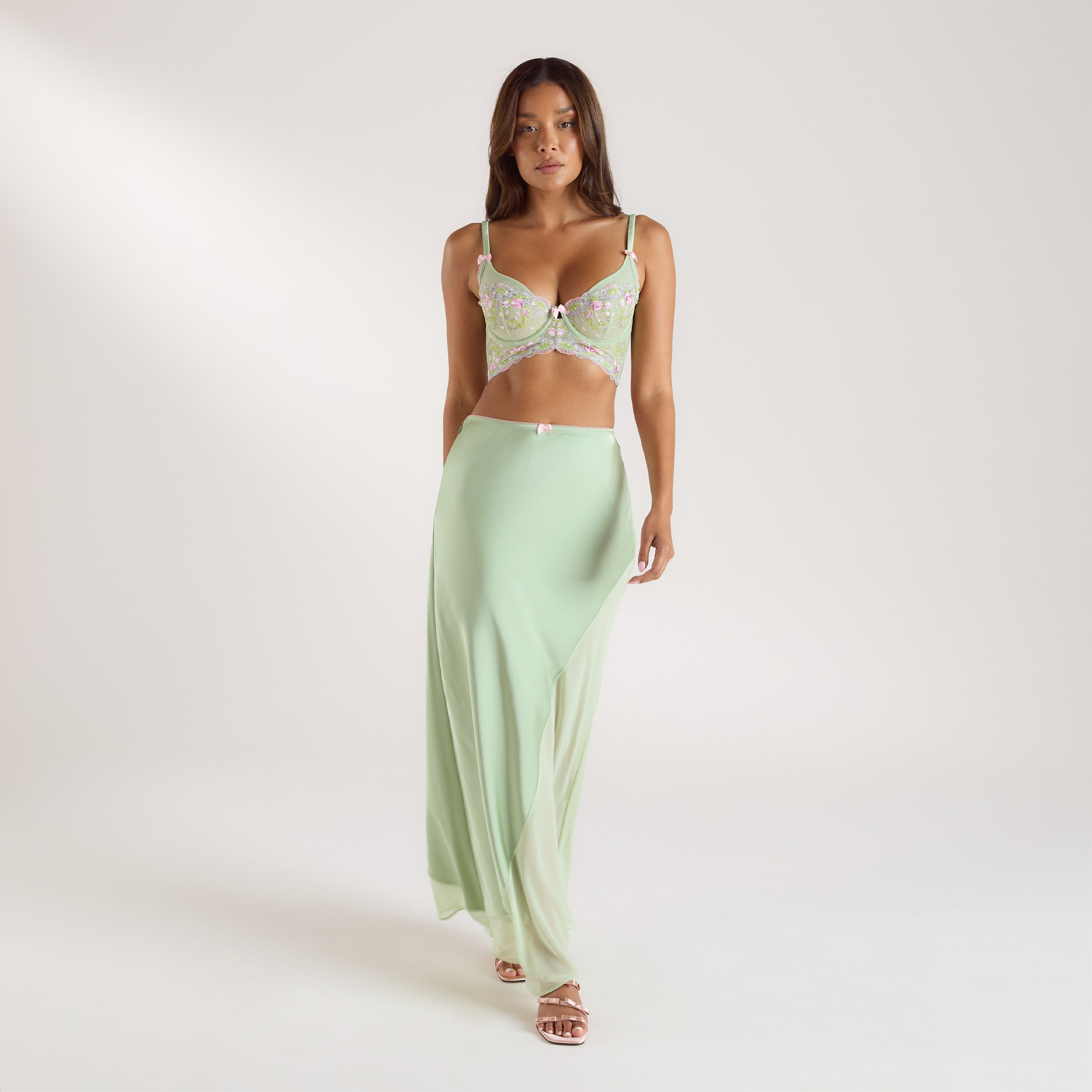 Der Elyssia Longline-BH und Rock vereint Lounges Ursprung und Zukunft in einem besonderen Ensemble. Der Longline-BH wirkt klassisch feminin, während der Maxirock mit nahtfeinem Reissverschluss und transparentem Chiffon-Einsatz eine elegante Silhouette zaubert.