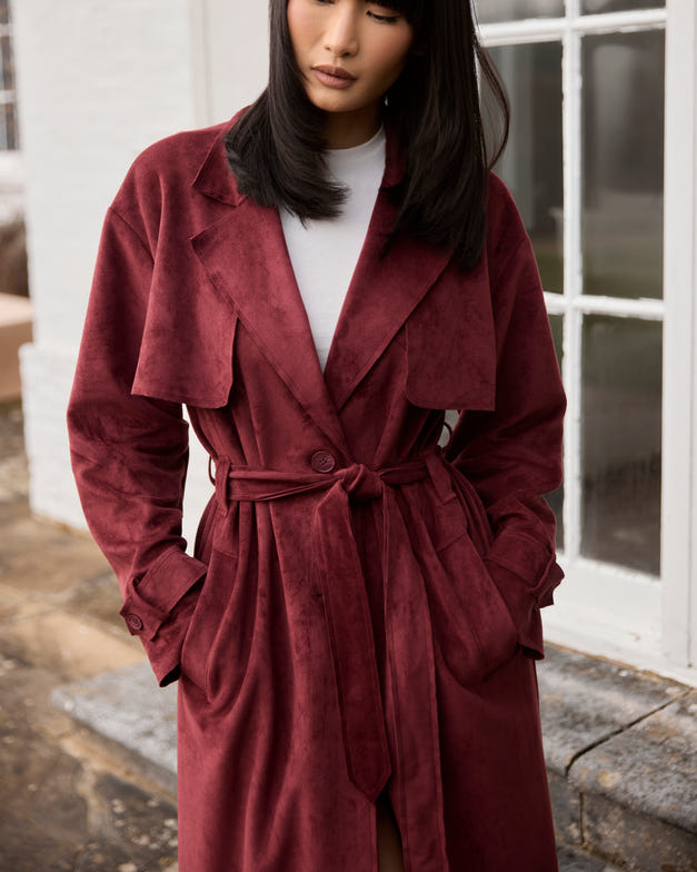 Contour Fashion macht Platz für High Fashion mit der Einführung des Wildleder-Trenchcoats. Dieses wunderschön tragbare Stück zeigt eine Meisterschaft in sorgfältiger Handwerkskunst, mit subtiler Markenkennzeichnung und Akzenten, die unmissverständlich Lounge sind.
